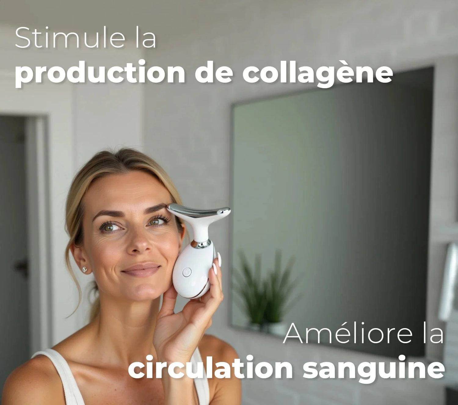 Les vibrations à haute fréquence stimulent la circulation sanguine et réactivent la microcirculation cutanée. Résultat : la peau est mieux oxygénée, plus lumineuse, et les tensions faciales responsables des rides d’expression sont relâchées.