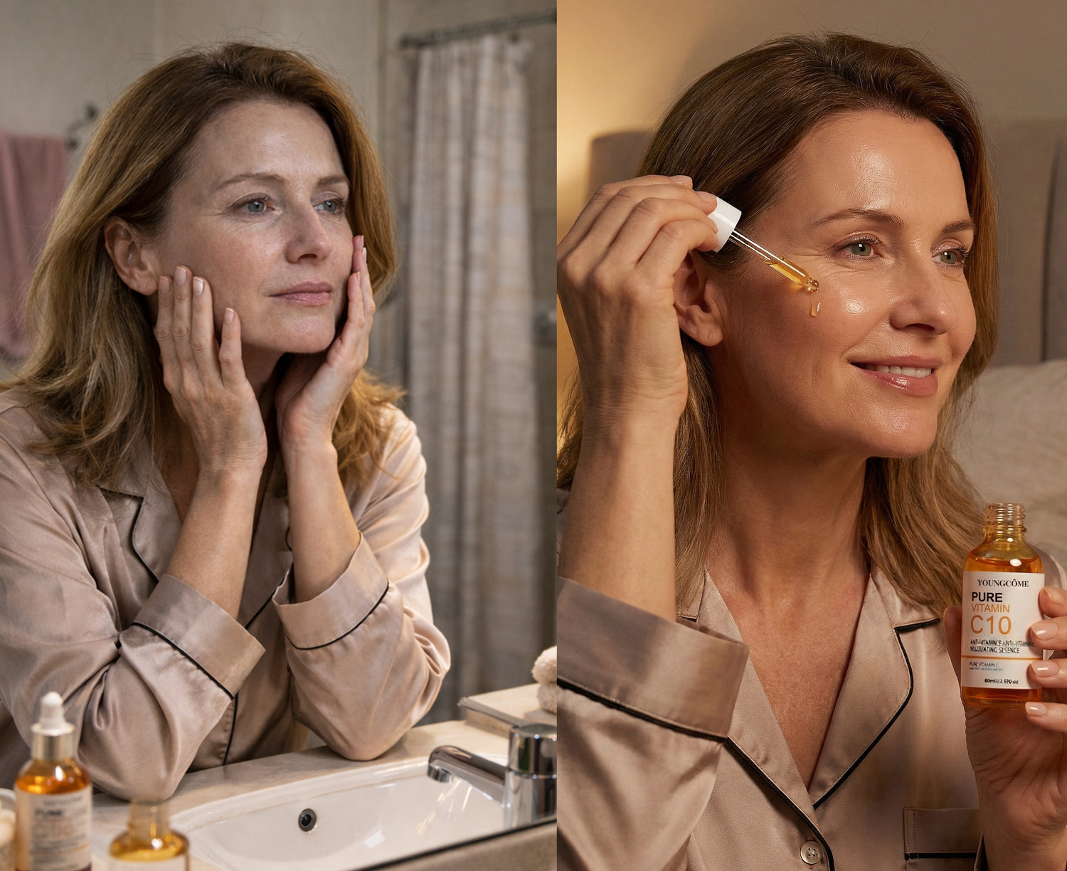 La vitamine C stimule la production de collagène et uniforme le teint pour une peau plus lumineuse et plus éclatante.