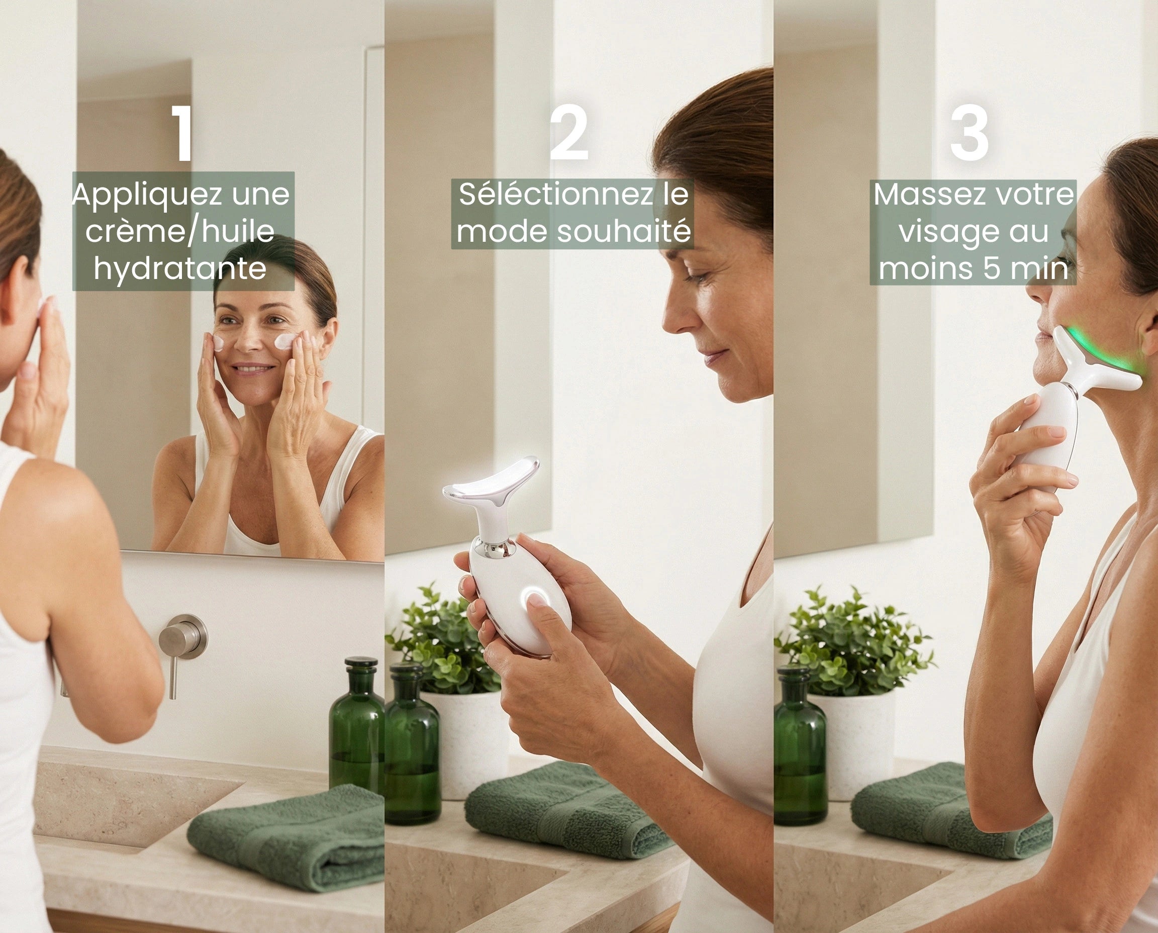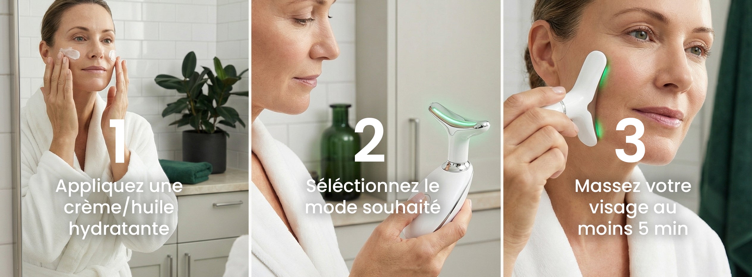 Une séance de 2 à 5 minutes par jour suffit. Le GlowSkin™ peut s’intégrer facilement à votre routine beauté quotidienne, comme le brossage des dents.