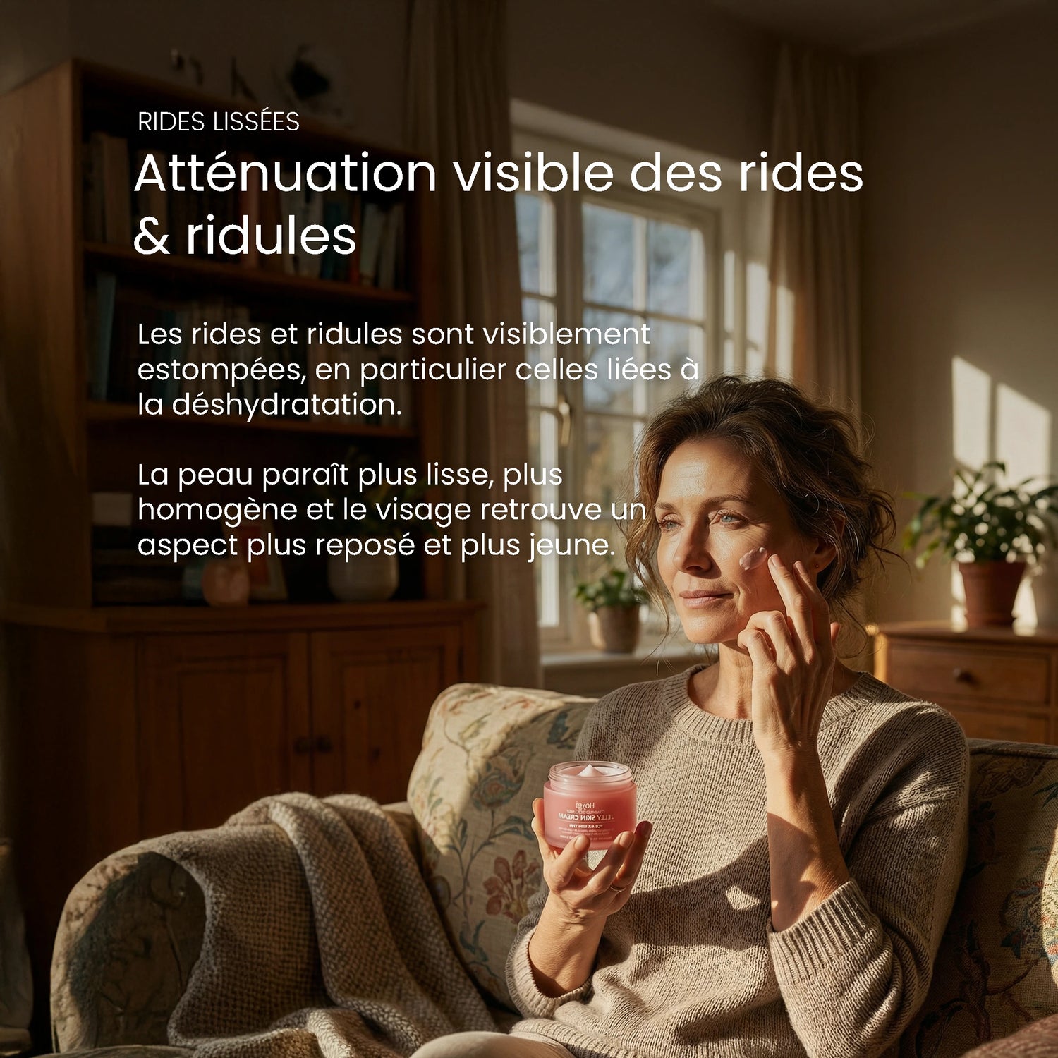 Une peau bien hydratée présente moins de micro-plis et réfléchit mieux la lumière, ce qui réduit visuellement la profondeur des rides.