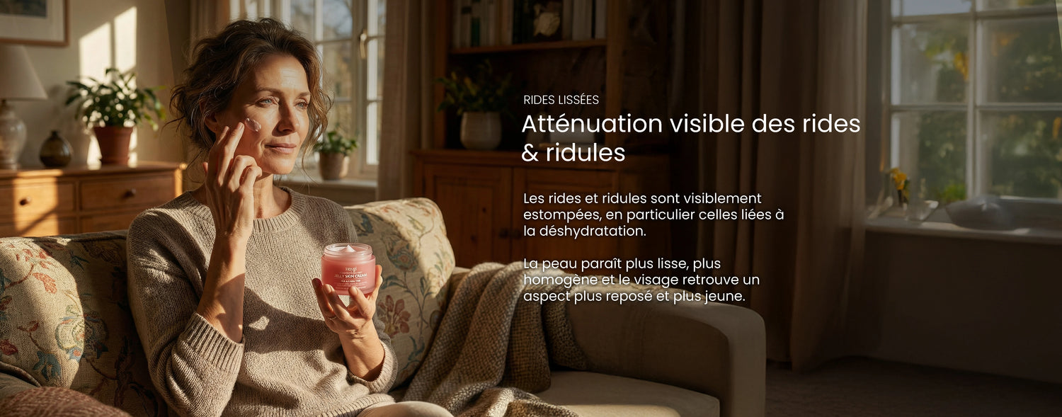 En améliorant l’hydratation et la texture de la peau, la crème aide à réduire l’apparence des ridules au quotidien.
